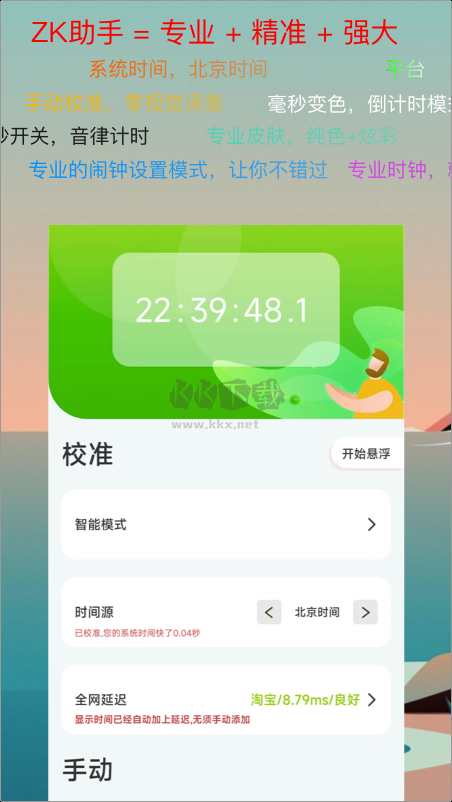 ZK助手懸浮時鐘安卓版是一款能夠懸浮在手機桌面的時鐘軟件,ZK助手懸浮時鐘安卓版能夠讓你的桌面變得更加有意思,時間可以幫助用戶們精準(zhǔn)到毫秒,讓你清楚的看到時間流逝的樣子,支持用戶進行手動校準(zhǔn),提高自己的時間觀念,感興趣的用戶快來KK下載體驗吧~
