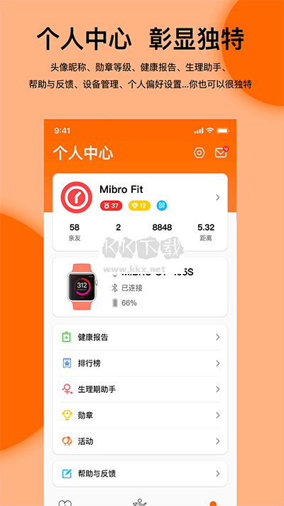頭像昵稱、勛章等級、健康報(bào)告、生理助手、幫助與反饋、設(shè)備管理、個人偏好設(shè)置等,讓你變得獨(dú)特。