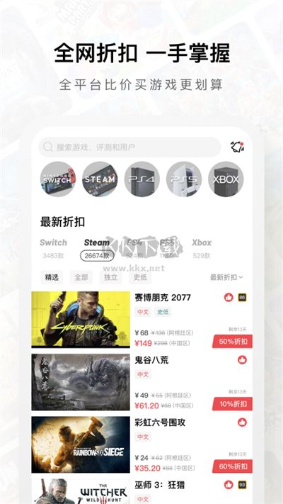 對比Switch、Steam、Playstation、Xbox游戲全球價(jià)格,商店打折即時(shí)提醒,讓你不再錯(cuò)過骨折和史低,半價(jià)玩到3A游戲不是夢。任天堂、索尼、PC、微軟Xbox玩家的游戲折扣助手。