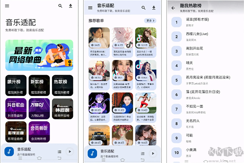 1.海量曲庫(kù):音樂(lè)適配APP擁有數(shù)百萬(wàn)首正版音樂(lè),涵蓋了流行、搖滾、民謠、電子、古典等各種風(fēng)格,無(wú)論你是搖滾青年還是古典音樂(lè)愛(ài)好者,都能在這里找到你的最愛(ài)。