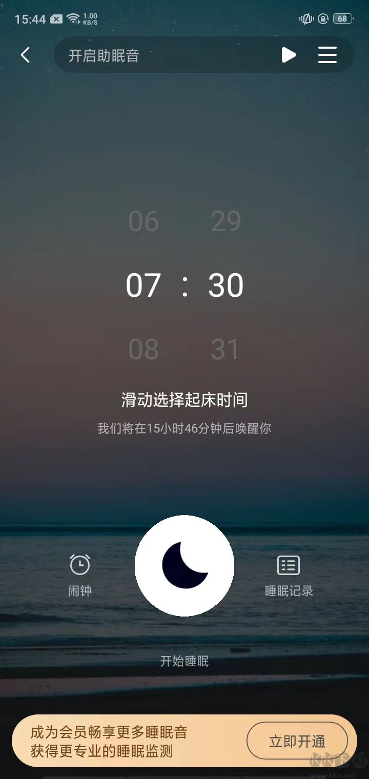 4、在下方【睡眠】功能中,用戶可以設(shè)置自己的起床時(shí)間,點(diǎn)擊左方的鬧鐘圖標(biāo),可以進(jìn)行鬧鐘鈴聲、輕喚醒、輕喚醒場(chǎng)景音的設(shè)置;