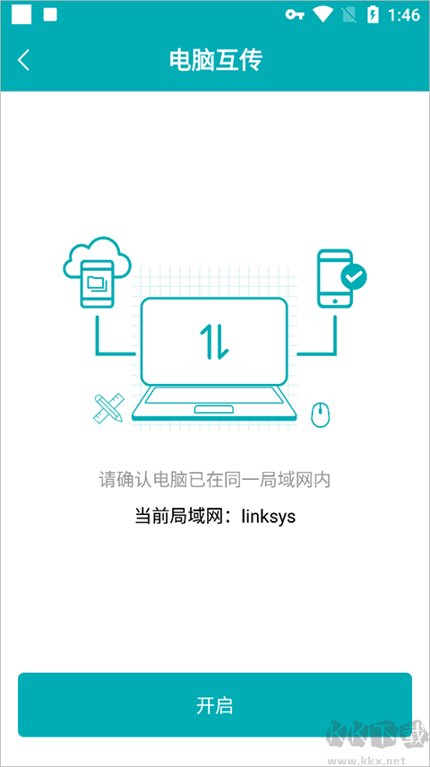 4、這個(gè)時(shí)候就可以進(jìn)入到一個(gè)電腦互傳的頁(yè)面,點(diǎn)擊“開(kāi)啟”。
