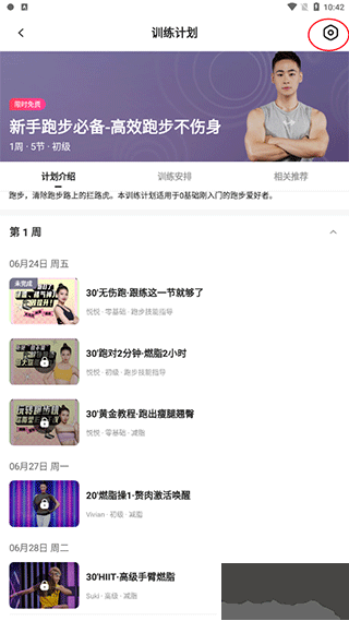 2、選擇你需要退出的計(jì)劃,點(diǎn)擊右上角的“訓(xùn)練計(jì)劃設(shè)置”。