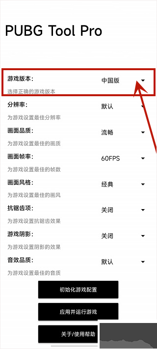 1、下載并安裝成功后打開軟件,首先需要選擇自己游戲的版本,軟件不僅支持和平精英的畫面比例修改,同時也支持國際版,按需選擇即可。