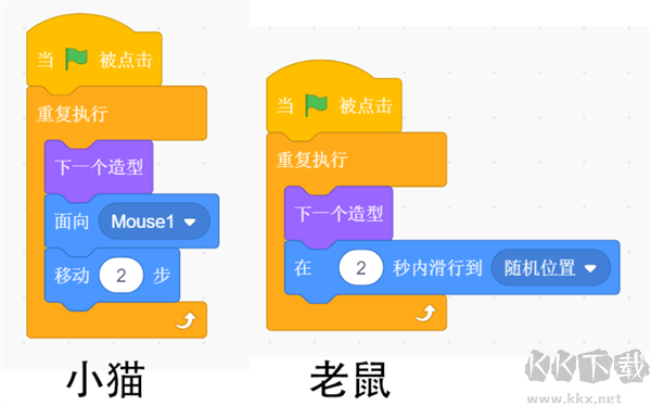 2、分別選擇小貓和老鼠的編程代碼。