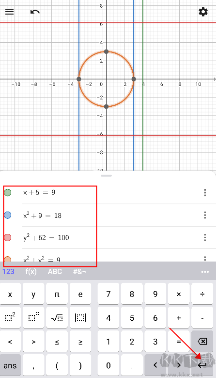 1、用戶只需用下方鍵盤輸入函數(shù),點擊回車鍵,然后上面就會出現(xiàn)對應的函數(shù)圖形。