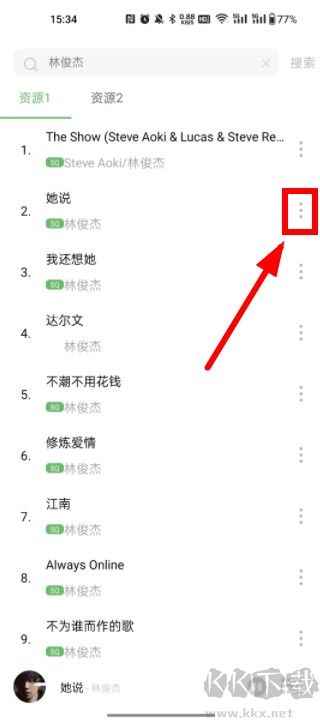 2、搜索到之后點擊歌曲右側(cè)的三個點,底下會彈出多個功能,如下圖所示。