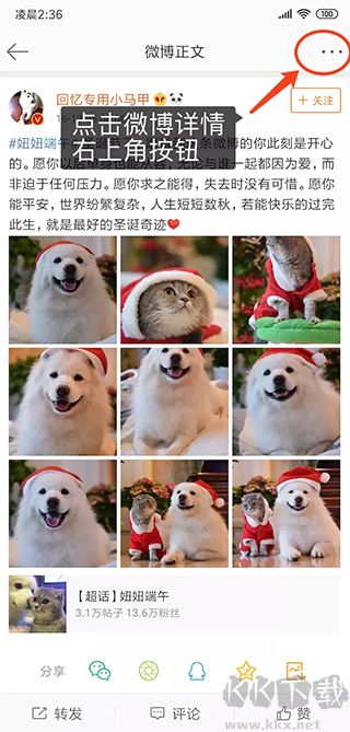 1、這里以微博為例,其他平臺類似,均為“復(fù)制鏈接”下載。在微博詳情中,點擊右上角按鈕。