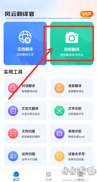 1、在本站下載并安裝風(fēng)云翻譯官,進(jìn)入首頁點(diǎn)擊上方的在線翻譯或拍照翻譯按鈕即可快速進(jìn)行翻譯