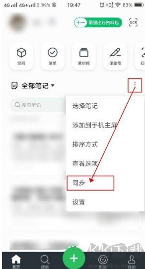 6、回到首頁,點(diǎn)擊全部筆記后的三點(diǎn)按鍵,點(diǎn)擊同步,即可以在首頁刷新出剛才保存的筆記。