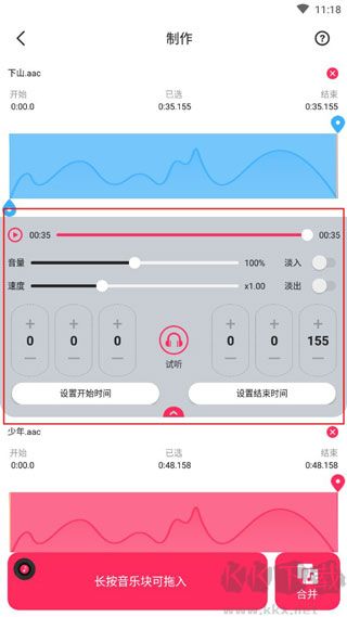 7、【復(fù)雜組合應(yīng)用】能做上面那些事情,肯定能通過組合以對付復(fù)雜使用場景。這一切無論是部分截取、修剪串接、復(fù)制重復(fù)、調(diào)節(jié)音量(可漸入漸出)、或是添加背景,所有相關(guān)的曲子片段都在同一個面板上排列,想怎么弄就怎么弄。