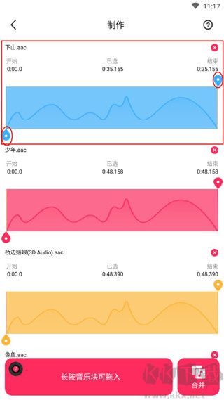 2、【音樂拼接串燒】不同的曲子修剪截取留下需要的部分,然后就像接繩子那樣串連起來組合成新的曲子音頻。