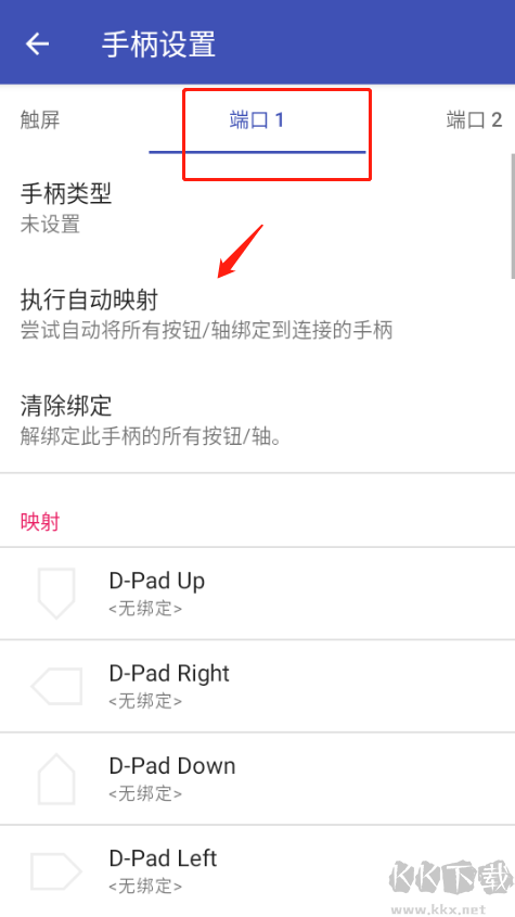 接著在“手柄設(shè)置”上方導(dǎo)航欄中選中端口 1選項,并在打開的界面中執(zhí)行自動映射或手動設(shè)置手柄按鍵映射