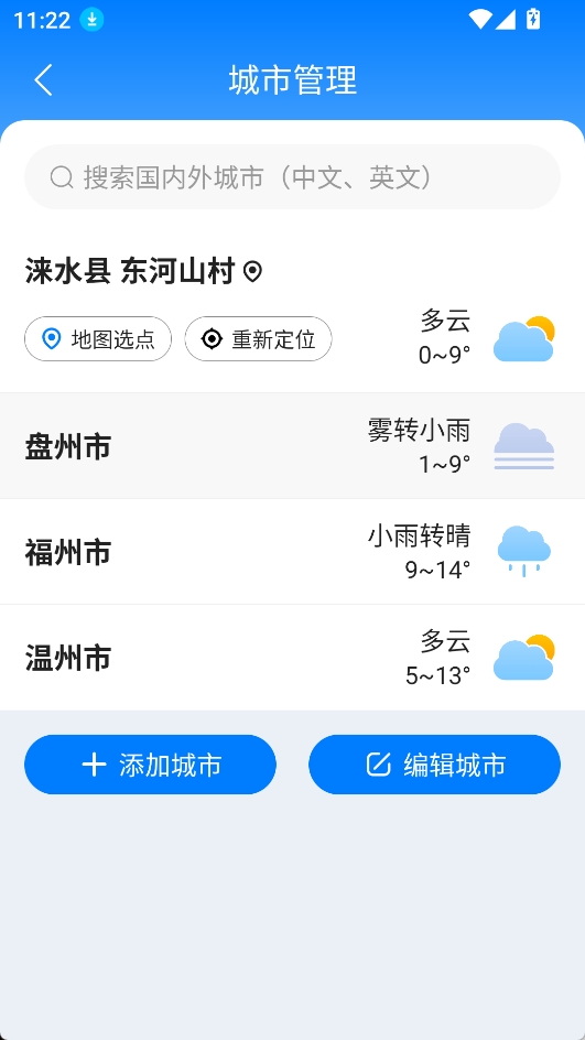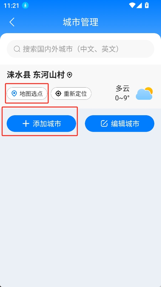 2.點(diǎn)擊添加城市,如果您想要添加的城市是您當(dāng)前的所在地,也可以直接點(diǎn)擊地圖選點(diǎn)直接添加;