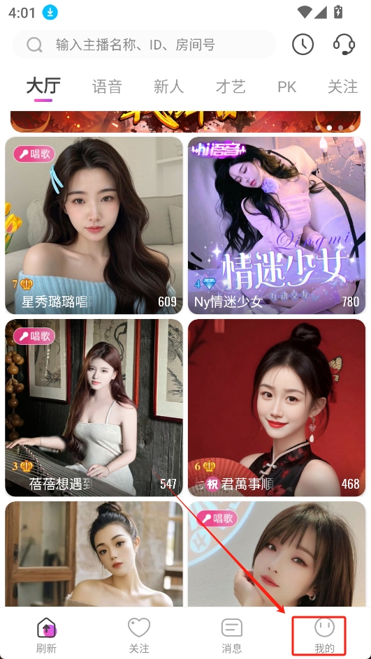 1.打開蜜瘋直播app,進(jìn)入主頁后點(diǎn)擊右下角“我的”。如圖所示: