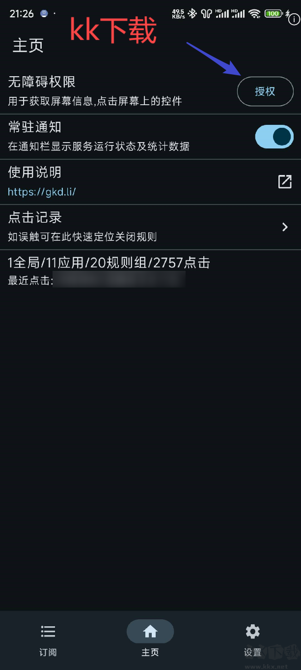 開(kāi)啟后進(jìn)入 GKD 的首頁(yè)。為確保 GKD 能夠正常運(yùn)行,需授予其無(wú)障礙權(quán)限。