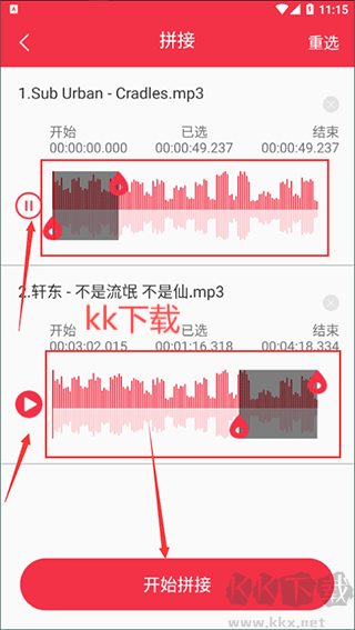 3、隨后對(duì)三個(gè)文件的起止位置進(jìn)行挑戰(zhàn),點(diǎn)擊左側(cè)按鈕即可試聽(tīng)片段。完成操作后,點(diǎn)擊 “開(kāi)始拼接” 選項(xiàng),之后請(qǐng)耐心等待數(shù)秒;
