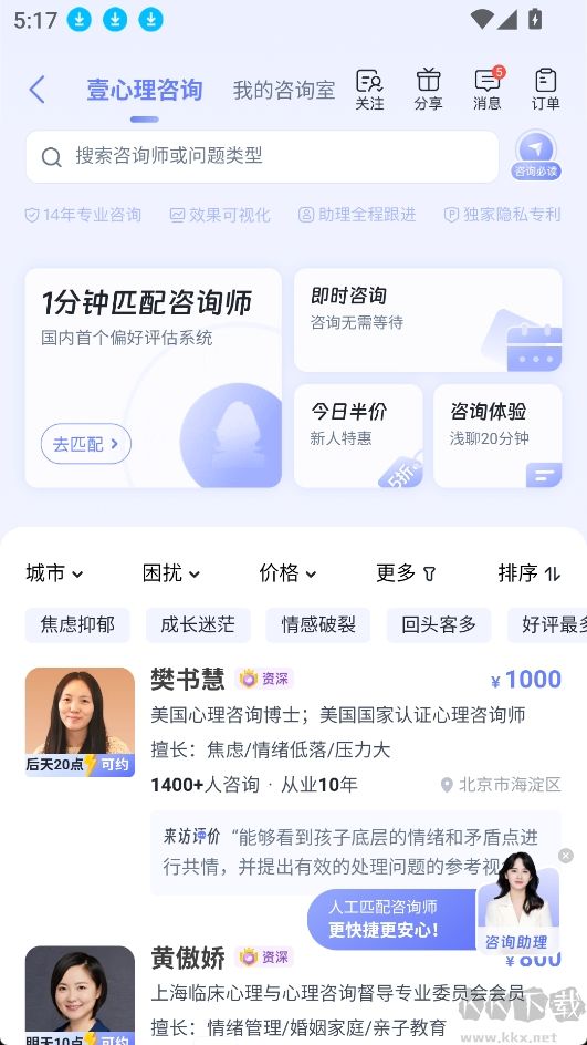 2.專業(yè)心理咨詢師,可以預(yù)約語音、視頻或面對面咨詢,可以按城市、價(jià)格、咨詢方向等選擇咨詢師;