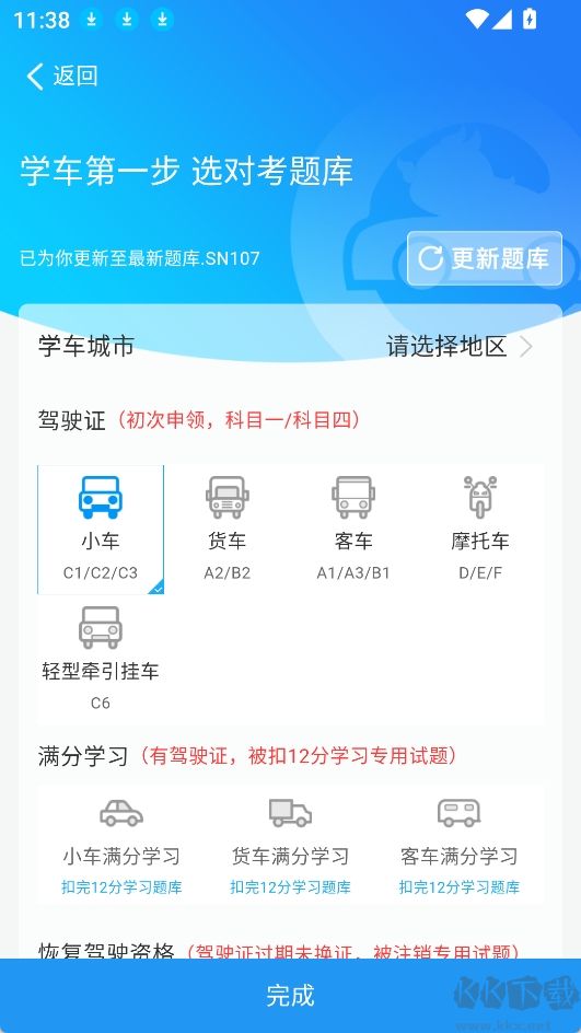 1.打開app主頁,選擇要考的駕駛證類型,選擇完成后點擊完成;