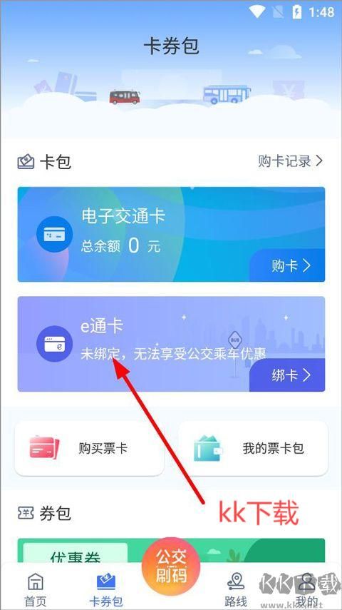 2、進(jìn)入卡券包頁面,在卡包中能夠查看購卡記錄,其中包含電子交通卡、e 通卡以及乘車優(yōu)惠券等。請點擊 e 通卡;
