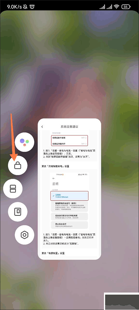 首先,請進入手機的應用后臺任務欄。長按 “云聽” 應用圖標,待手機界面旁彈出一系列小功能選項后,選擇 “鎖定” 圖標,即可為該應用進行鎖定操作。