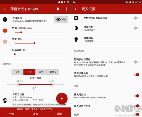 薄暮微光漢化版是一款專業(yè)的睡眠輔助軟件,這款軟件能夠隨著時間變化,改變屏幕的顯示畫面,太陽下山后,手機(jī)、平板屏幕上的藍(lán)光就被它去掉,換成舒服的紅色光,保護(hù)你的眼睛,這樣一來,身體里管作息的激素能正常分泌,讓人睡得更香,要是你睡覺總不踏實就快來kk網(wǎng)站下載體驗一下吧。
