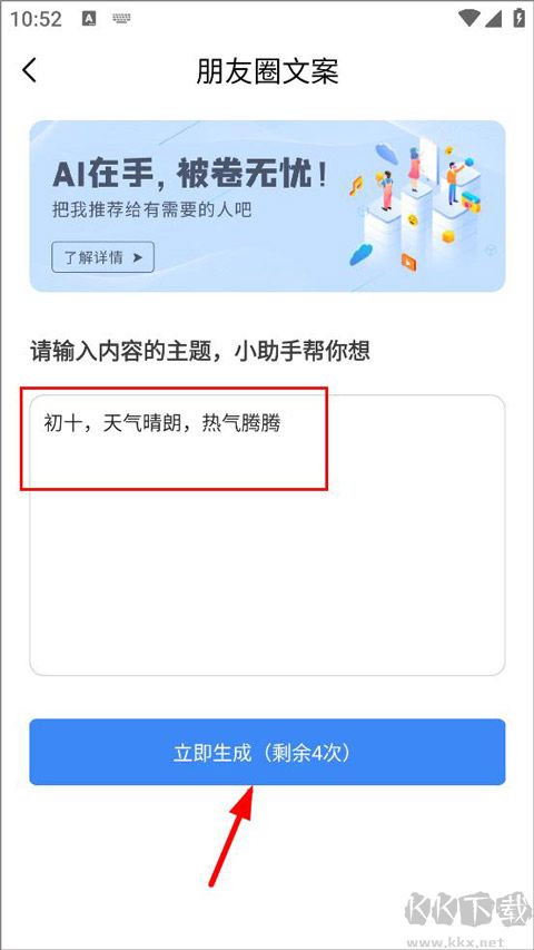 2、在開啟編輯頁面后,用戶需輸入文案主題,并點擊 “立即生成”;