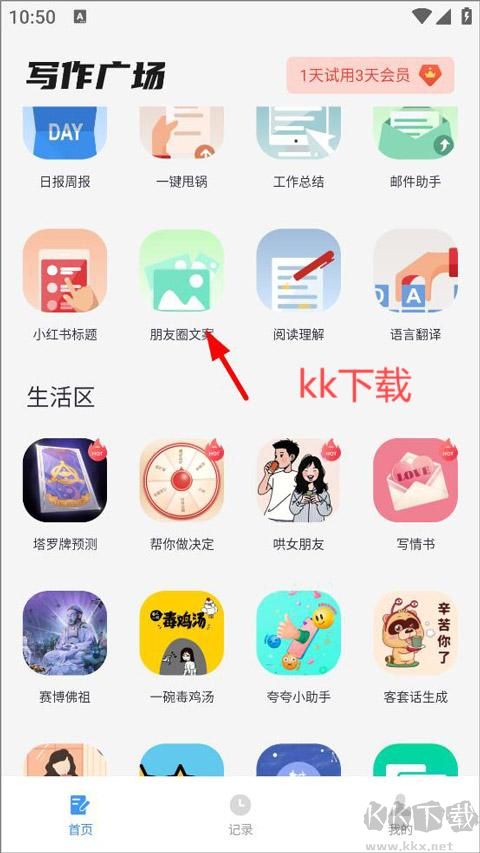 1、用戶開啟日報周報生成器 APP 并登錄,進入首頁。首頁劃分為兩個部分,即工作區(qū)(涵蓋日報周報、工作總結(jié)、文案等內(nèi)容)與生活區(qū)(包含寫情書、毒雞湯、評價等內(nèi)容)。之后,用戶點擊工作區(qū)內(nèi)的日報周報選項 ;