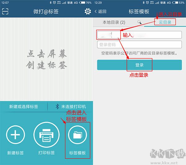于軟件主界面,點擊【標(biāo)簽?zāi)0濉窟M入;選取【云目錄】,輸入登錄賬號:【掃碼哥】,無需輸入密碼,直接點擊【登錄】。