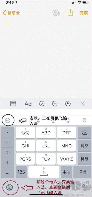 6、請您查找 “備忘錄” 應(yīng)用程序。進入該應(yīng)用后,創(chuàng)建一個空白頁面。之后,點擊輸入?yún)^(qū)域,再點擊鍵盤下方的 “小地球” 圖標以切換輸入模式。在眾多輸入法選項中,選擇帶有 “訊飛” 標志的輸入法。完成上述操作后,即可正常使用該輸入法進行輸入,其輸入方式與其他輸入法相似,操作簡便易上手;