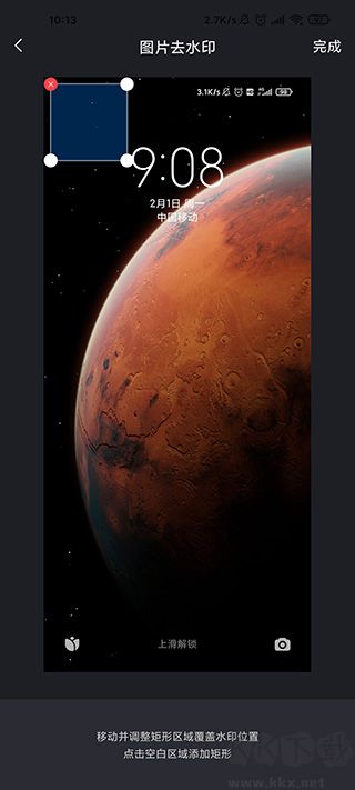 2.【圖片去水印】:僅需將圖片導入至應用程序,框選需去除的水印區(qū)域,點擊完成即可實現(xiàn)水印消除。