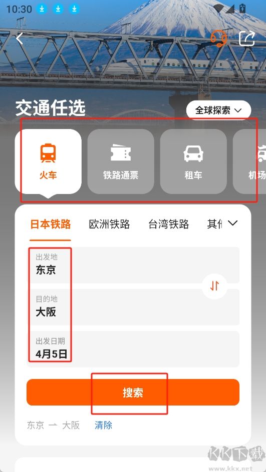 2.選擇交通方式、出發(fā)地點(diǎn)和到站地點(diǎn),最后選擇出發(fā)日期后點(diǎn)擊搜索;