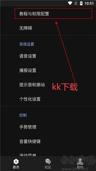 1、在kk下載站下載并打開app,點擊【教程與權(quán)限配置】。