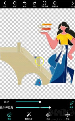 3、請(qǐng)選擇對(duì)應(yīng)的圖片,點(diǎn)擊【精修】選項(xiàng)。隨后,選擇【橡皮】功能,對(duì)橡皮大小以及操作桿距離進(jìn)行調(diào)整。依照?qǐng)A圈形狀移動(dòng)操作,直至相關(guān)內(nèi)容被徹底扣除干凈。