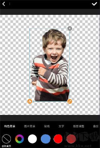 4、可自主選擇圖片背景、貼紙、文字、摳圖調(diào)整、疊加等功能。編輯工作完成后,點(diǎn)擊 “√”,隨后選擇保存即可。