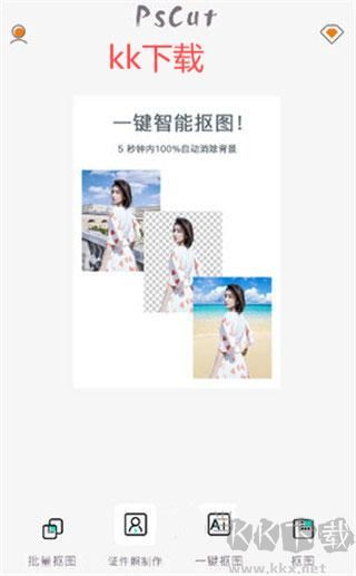 1、在kk下在站下載并開啟PS摳圖軟件,在首頁(yè)點(diǎn)擊【一鍵摳圖】選項(xiàng)