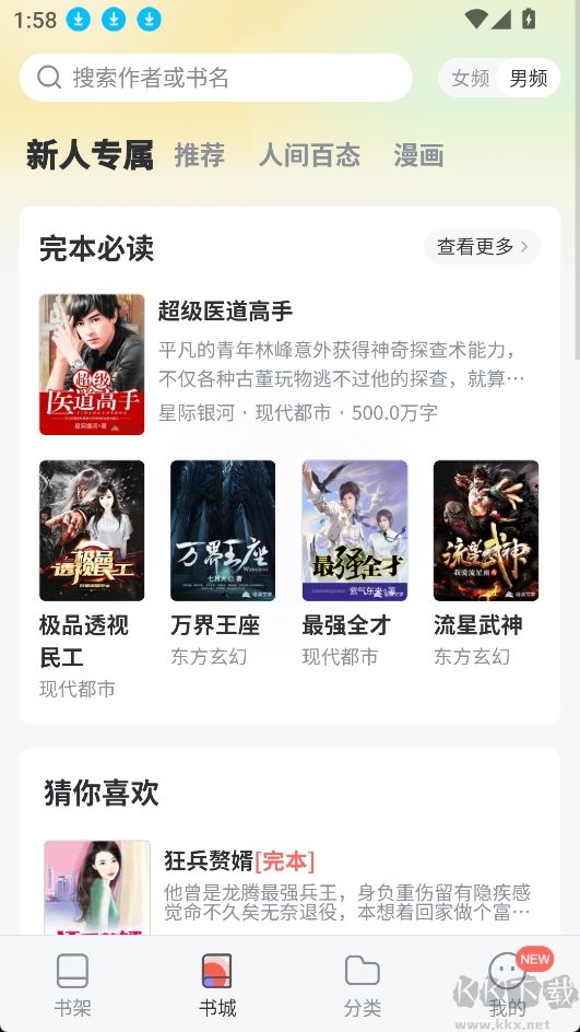 4.分頻榜單導(dǎo)航,按性別劃分閱讀頻道,細(xì)分新書、完結(jié)、口碑等多類排行數(shù)據(jù);