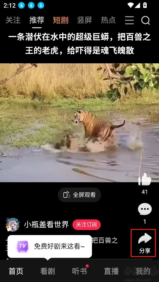 1.進(jìn)入app主頁,找到自己喜歡的視頻,點擊右下角的分享按鈕;