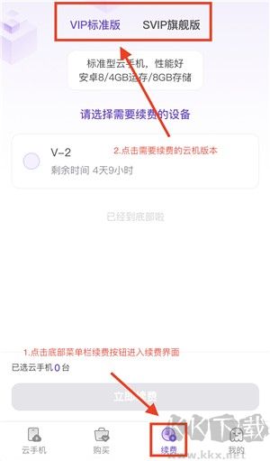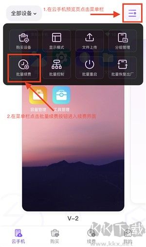 您可以一次性對多臺云手機進行續(xù)費,簡化操作流程。在App的上方菜單中,您會看到多個選項。請點擊“批量續(xù)費”選項。