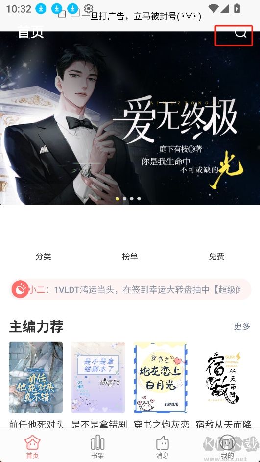 1.進(jìn)入app主頁,點(diǎn)擊右上角搜索,輸入你想要的書名;