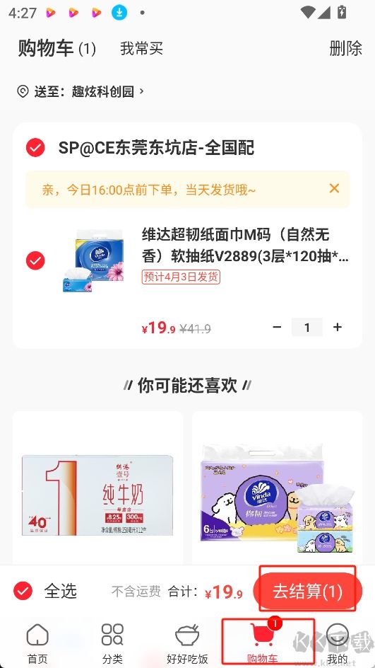 3.返回主頁點擊購物車,然后選擇想要購買的商品一鍵支付即可。