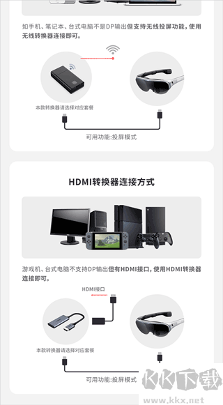 像蘋果手機(jī)這類不支持 DP 輸出的設(shè)備,可借助無線投屏手段,或是利用轉(zhuǎn)接器來與 AR 眼鏡建立連接。