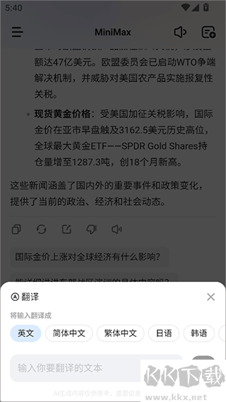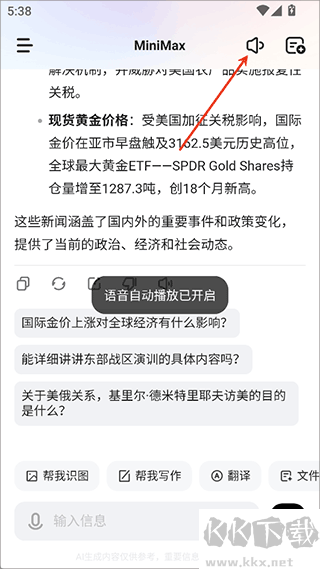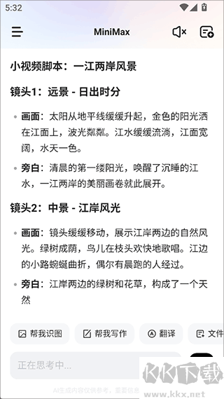 MiniMax免費版屬于AI智能輔助類軟件,它把超牛的 AI 技術(shù)和簡潔舒適的聊天界面巧妙結(jié)合,在這兒,你能用來搞創(chuàng)作,不管寫文案還是構(gòu)思創(chuàng)意都行,有問題也能問,它會給你解答,還能搜資料,日常交流也沒問題,不管你是工作上要提高效率,學(xué)習中想找思路,還是生活里有困惑,它都能提供超智能、超高效的體驗,幫你輕松應(yīng)對各種情況 ,感興趣或者有需要的小伙伴就快來kk網(wǎng)站下載體驗一下吧。