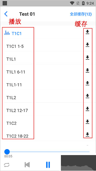 3、點(diǎn)擊相應(yīng)音頻即可播放,點(diǎn)擊右側(cè)圖標(biāo)則可下載對(duì)應(yīng)的音頻資源。