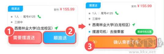 情況二:若由擺渡司機(jī)負(fù)責(zé)送載,先點(diǎn)擊②「需要擺渡送」,此時(shí)可查看擺渡司機(jī)的位置和距離信息;之后通過滑動(dòng)操作執(zhí)行③「確認(rèn)乘客下車」,“乘客已下車” 按鈕隨即置灰(不可操作)