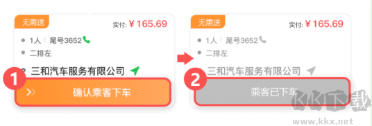 操作步驟:通過滑動(dòng)操作,先后完成①「確認(rèn)乘客下車」;②“乘客已下車” 按鈕置灰(不可操作)。