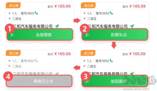 操作步驟:經(jīng)滑動(dòng)操作,依序完成①「去接乘客」;②「到乘車點(diǎn)」;③「接到乘客」;④“乘客已上車” 按鈕置灰(不可操作)。