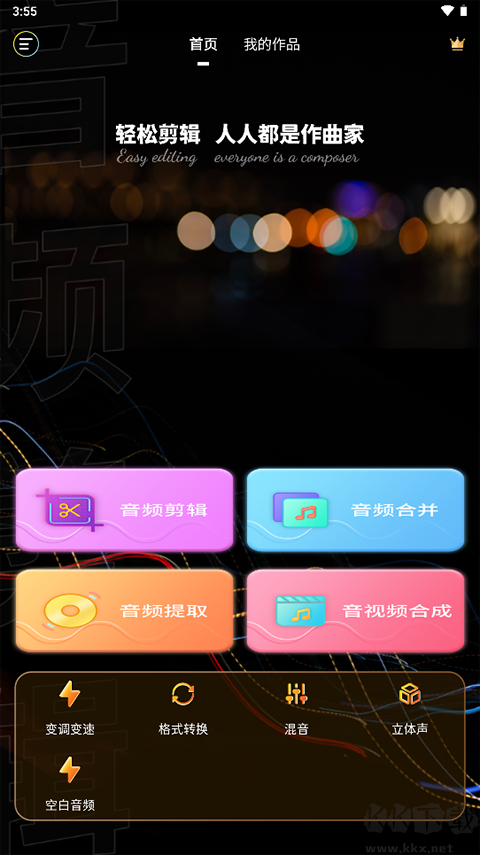 1、在kk下載站下載,安裝完成后將其打開,在主界面中明確選擇 “音頻剪輯” 選項(xiàng) 。