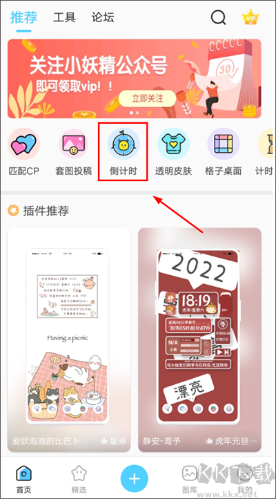 1、進(jìn)入倒計(jì)時(shí)功能:打開小妖精美化 app,在首頁點(diǎn)擊【倒計(jì)時(shí)】功能選項(xiàng) 。