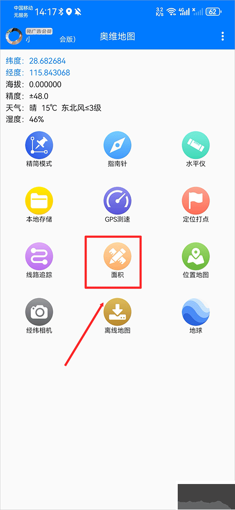 1、打開(kāi)應(yīng)用,點(diǎn)擊 “面積” 按鈕進(jìn)入測(cè)量操作界面。